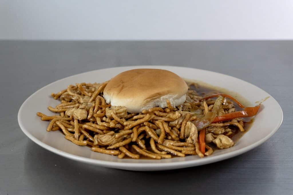 When spooned onto a bun, the sauce soaks into the noodles just enough to soften them while leaving some crunch. The combination is messy, satisfying, and completely unique. Families in the region still enjoy this version at home and in restaurants, keeping the tradition alive generation after generation.