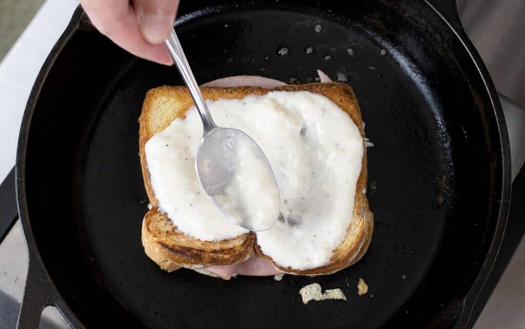 - Spread half of the béchamel over the 4 slices of bread. Reserve the rest for topping.