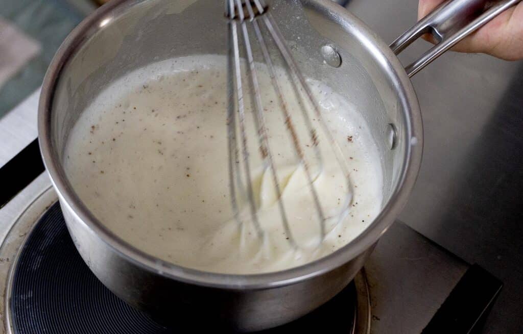 - Slowly add half of the hot milk mixture while stirring. Once smooth, add the rest of the milk, nutmeg, salt, and pepper.