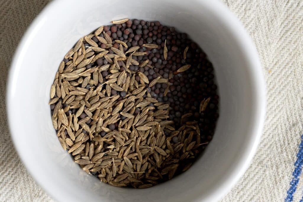 • Toast ½ teaspoon mustard seeds and ½ teaspoon cumin seeds for about 1 minute.