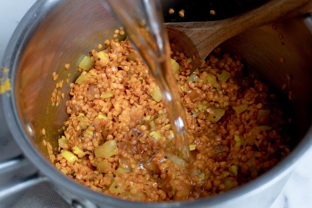• Add 1½ cups red lentils, rinsed, 3 to 4 cups water (or broth), and 1 tablespoon chicken bouillon. Bring to a gentle boil, then reduce to simmer. Cook about 15 minutes, stirring occasionally.
