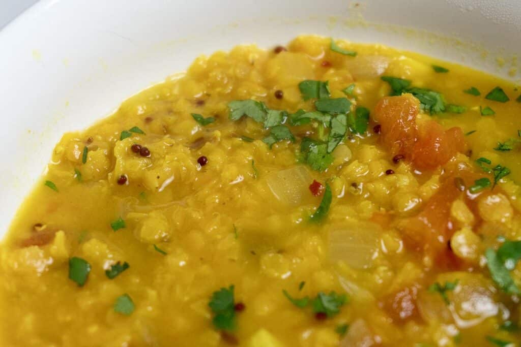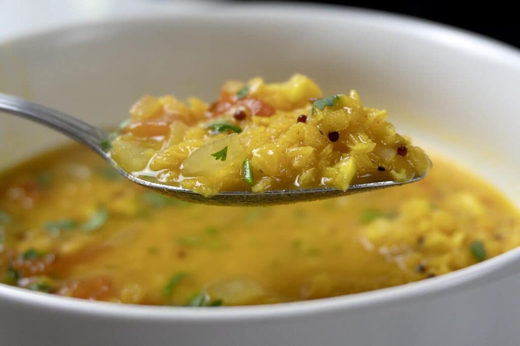 Lentils are small, fast-cooking legumes that turn a handful of pantry ingredients into a full meal. This recipe starts with ghee, mustard seeds, cumin seeds, onion, garlic, and a touch of serrano. Red lentils do the heavy lifting, softening quickly into a cozy stew that works any night of the week.