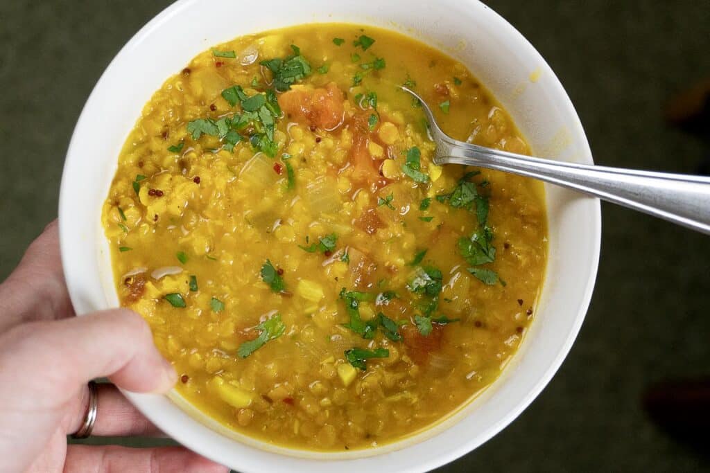 This recipe uses red lentils for a silky texture and quick cook time. They usually soften in 15 to 20 minutes.