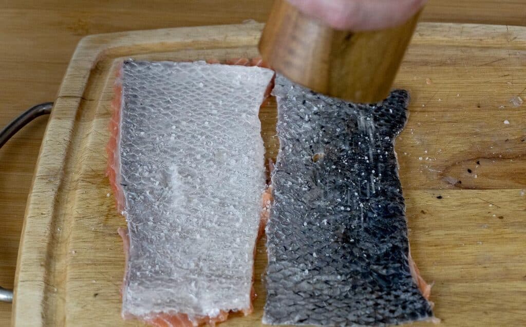 - While the rice is going, season your salmon skin generously with salt.