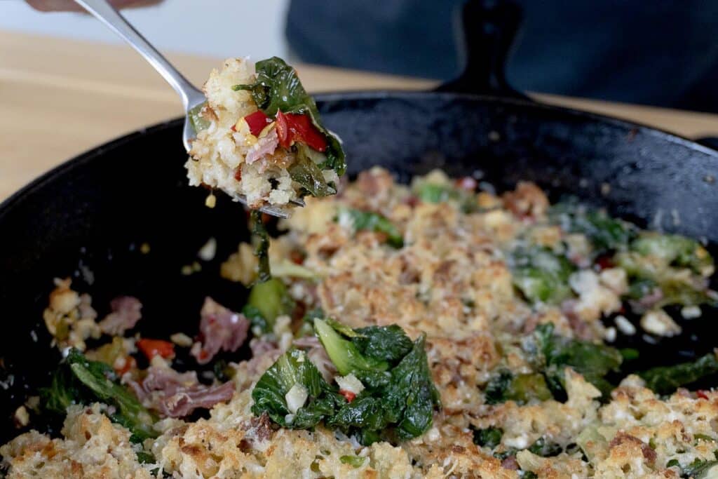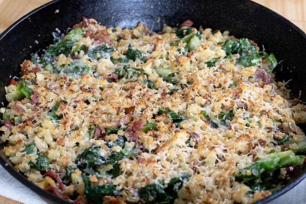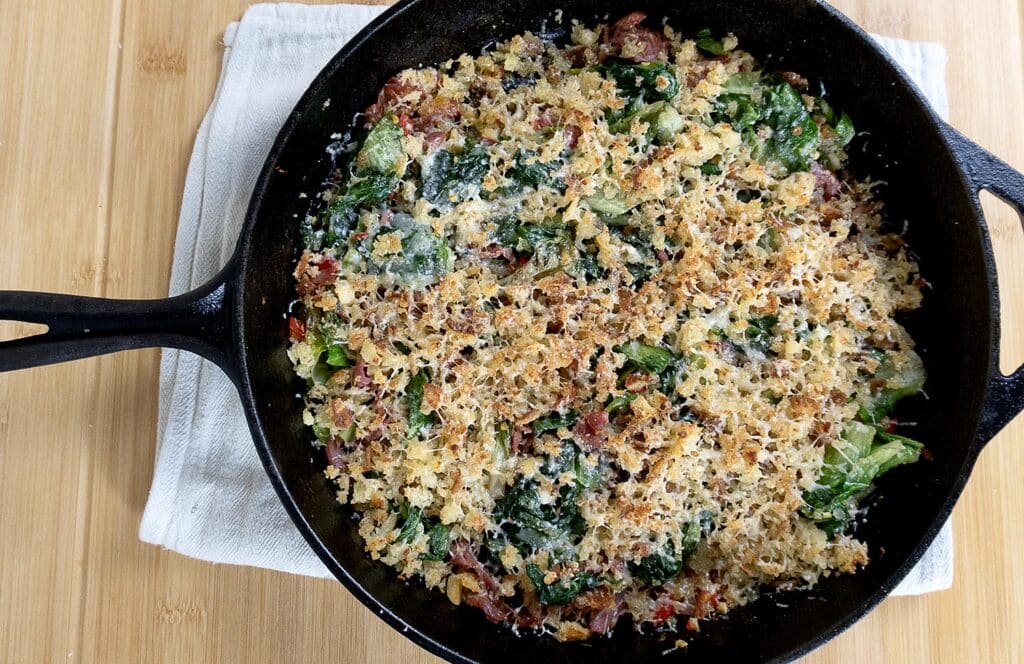 Sprinkle in half of the breadcrumb mixture and stir for 1 to 2 minutes over medium heat. The crumbs will absorb juices and start to cling to the chopped greens. Smooth the top, then scatter the remaining breadcrumb mixture over the surface along with ½ cup more grated Parmigiano-Reggiano.